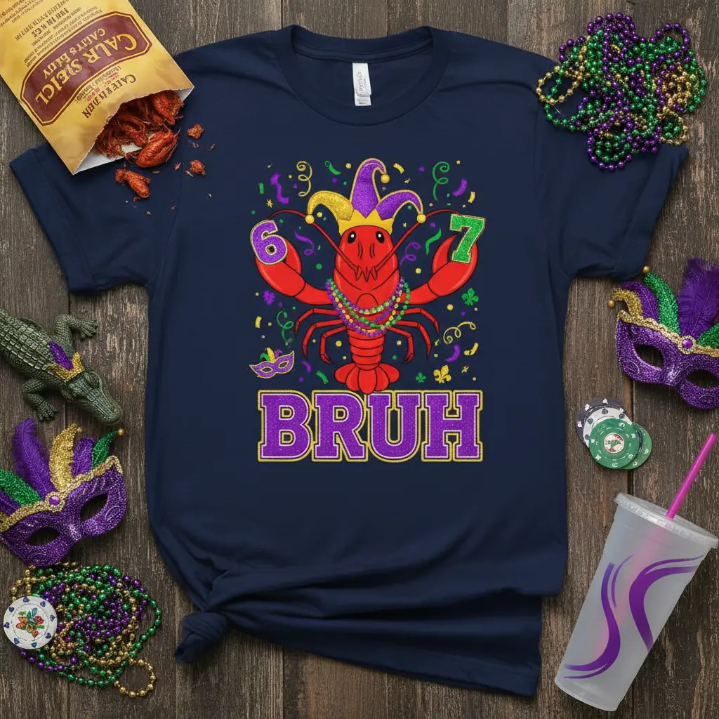 This BRUH t-shirt is more than just a novelty item; it’s a celebration of Cajun culture and the joyous atmosphere of Mardi Gras. The central lobster graphic, a symbol of delicious crawfish often enjoyed during Louisiana festivals, is rendered in a fun, cartoonish style. Surrounded by confetti, masks, and festive numbers, the design encapsulates the energy and excitement of the event. It’s perfect for anyone who loves crawfish, parties, and a good laugh.