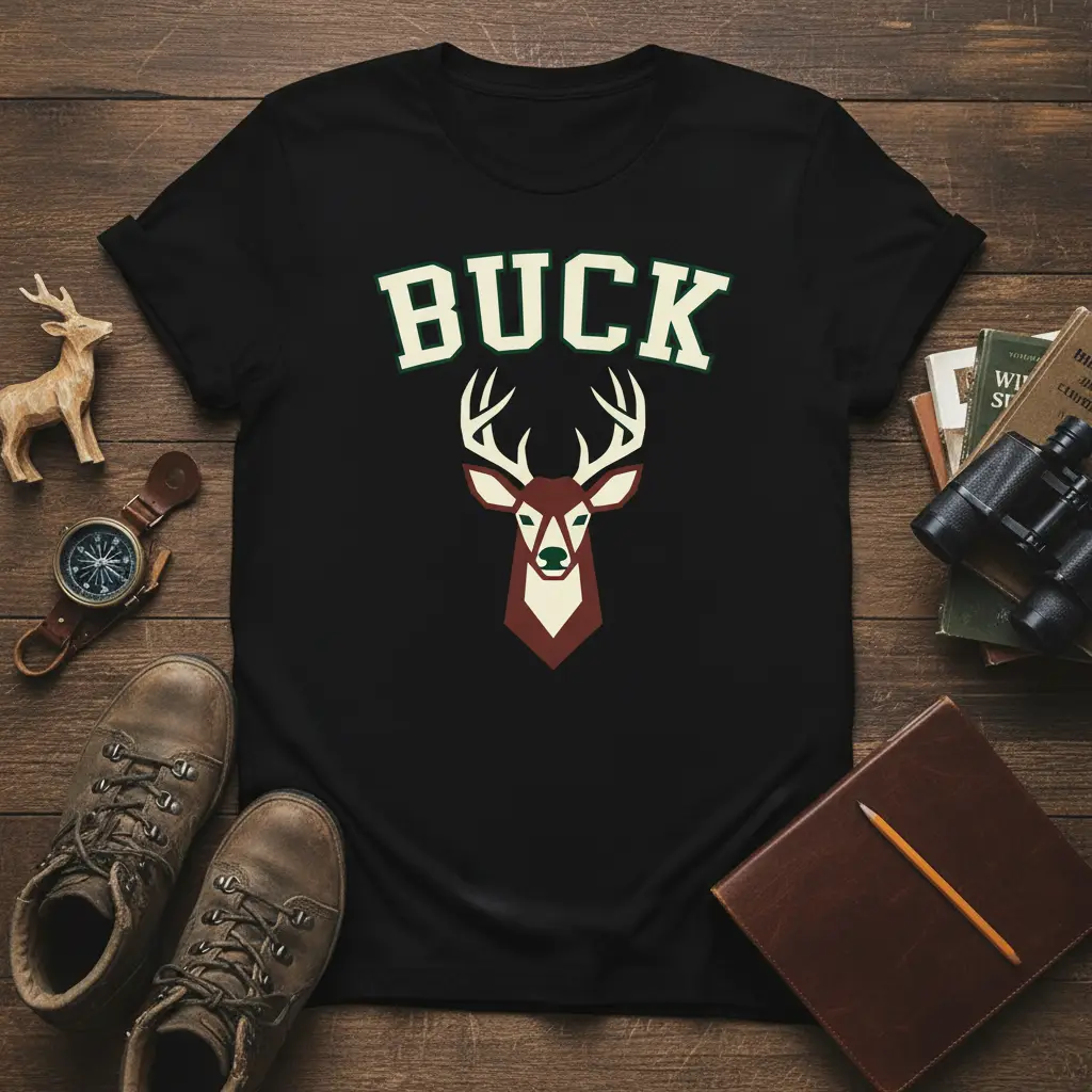This t-shirt features the word “BUCK” prominently displayed in a clean, collegiate-style font, rendered in crisp white with a deep green outline. Beneath the text, a stylized deer head emerges, its antlers reaching upwards, presented in a sophisticated palette of maroon and cream. The graphic design is modern yet timeless, appealing to both seasoned hunters and casual admirers of wildlife. It’s a design that speaks volumes without being overly loud, embodying a quiet confidence and appreciation for the natural world.