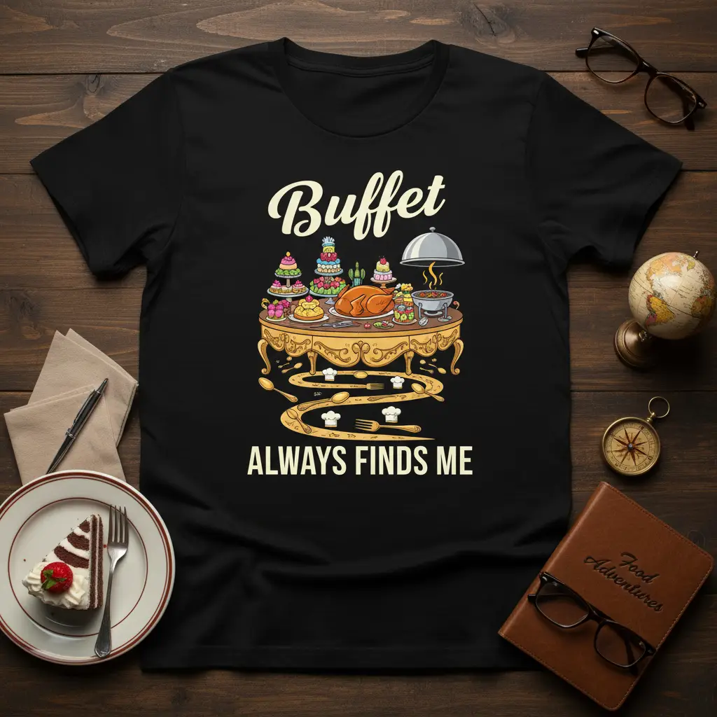 Searching for a unique and thoughtful gift? The “Buffet ALWAYS FINDS ME” T-Shirt is an excellent choice for birthdays, holidays, or just because. It’s designed for anyone who loves to eat, appreciates humor, and enjoys celebrating special occasions with delicious food. This tee is sure to become a favorite in their wardrobe, reminding them of joyous meals and good times.