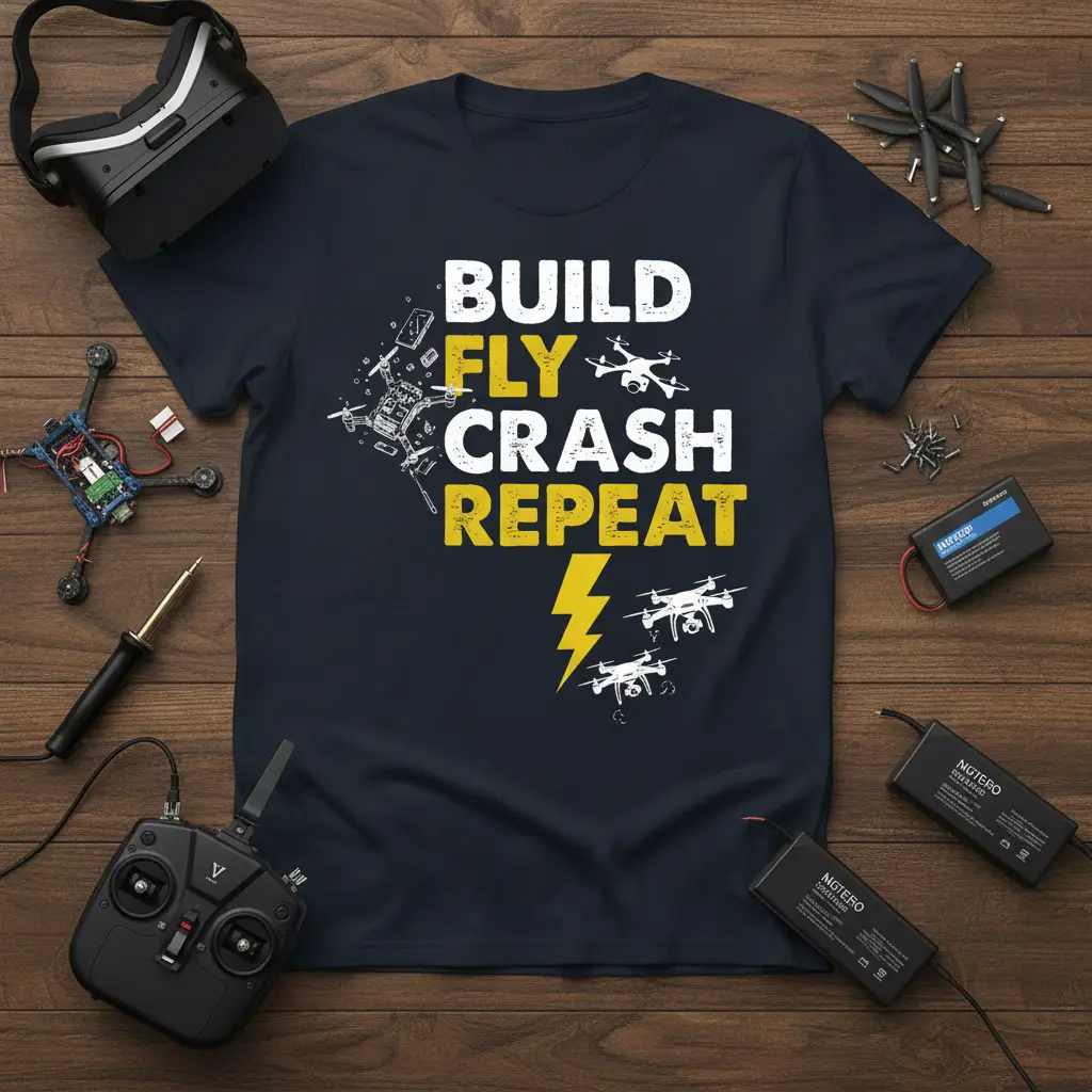 For anyone who lives and breathes drones, the cycle of “Build, Fly, Crash, Repeat” is a familiar and often humorous reality. This t-shirt celebrates that dedication with a bold graphic design that resonates with pilots of all levels. Whether you spend your weekends tinkering with components or soaring through obstacle courses, this tee is a perfect representation of your passion. It’s designed to be comfortable for long days at the field or workshop, making it an ideal addition to any drone enthusiast’s wardrobe.