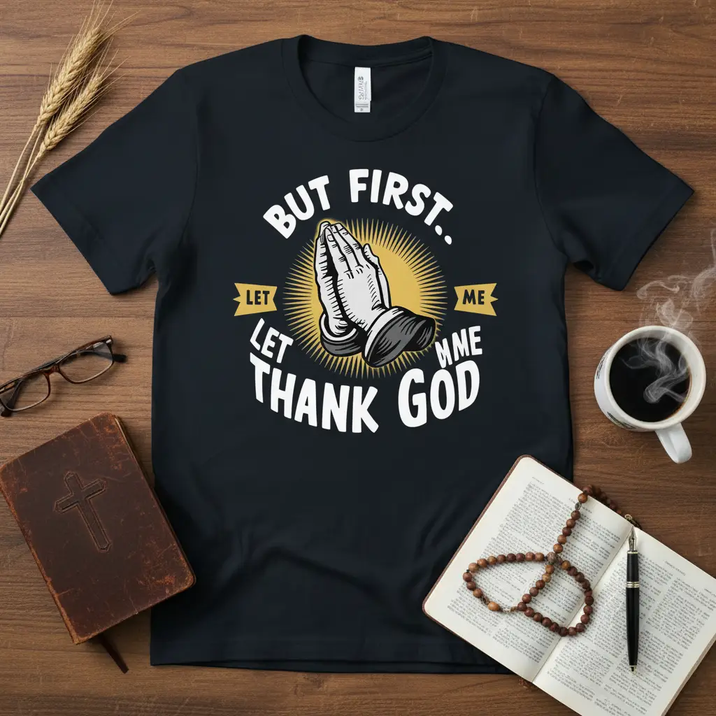 The graphic of praying hands is universally recognized as a symbol of supplication, devotion, and reverence. When paired with the phrase “But First Let Me Thank God,” it creates a powerful declaration of faith. This design speaks volumes about the wearer’s priorities and their deep-seated gratitude for life’s blessings, big and small. It’s a beautiful reminder to pause and acknowledge the divine presence in our lives, fostering a sense of peace and contentment.
