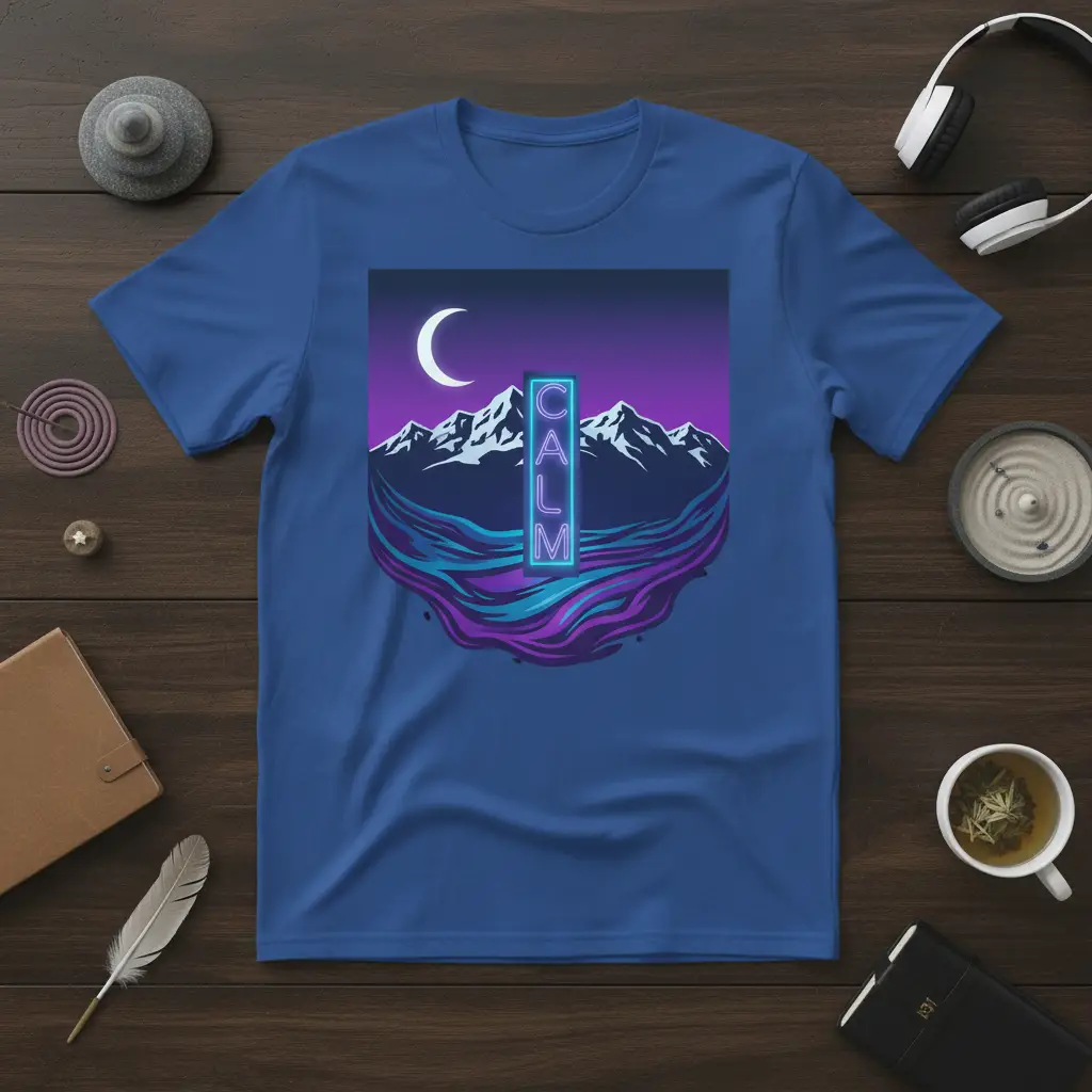 CALM is more than just a word; it’s a state of being, a feeling of deep tranquility that washes over you. This t-shirt captures that essence, featuring a breathtaking mountain landscape bathed in the ethereal glow of a neon sign. It’s designed for those who seek moments of peace in their busy lives, a wearable reminder to breathe deep and find serenity. The striking contrast of the vibrant neon against the majestic mountains evokes a sense of wonder and this design, making it a perfect addition to any wardrobe for those who value mindfulness and connection with nature.