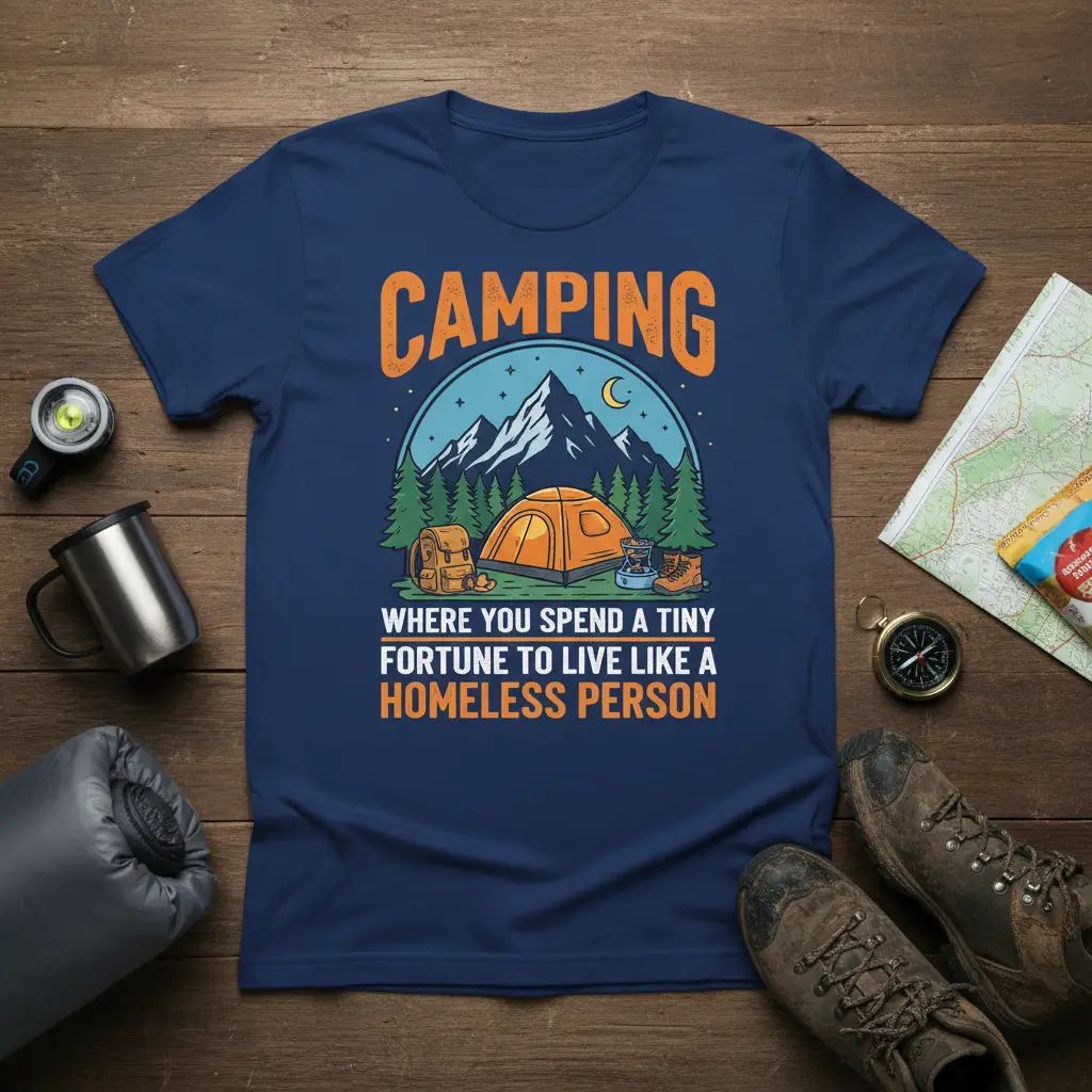 CAMPING WHERE YOU SPEND A TINY FORTUNE TO LIVE LIKE A HOMELESS PERSON. This statement t-shirt is for the true outdoor enthusiast who understands the unique financial commitment that comes with embracing nature. It humorously highlights the paradox of investing significantly in gear and experiences to achieve a simpler, more rustic way of life. Perfect for campers, hikers, and anyone who finds joy in the great outdoors, this tee is designed to spark conversations and laughter among fellow adventurers. It’s more than just apparel; it’s a badge of honor for those who appreciate the rugged charm and unexpected costs of their favorite pastime.