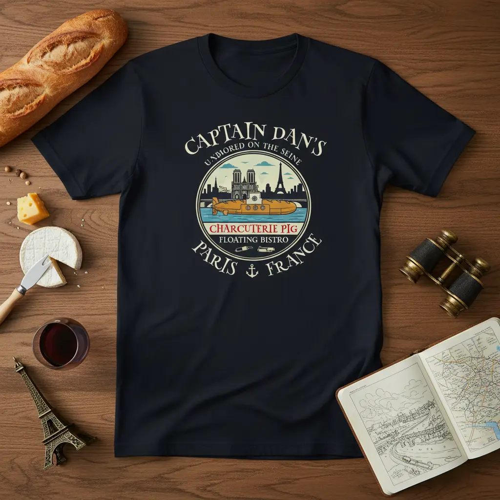 Embark on a culinary journey with the Captain Dan’s Charcuterie Pig Floating Bistro design, a unique concept that brings gourmet delights directly to the water. This t-shirt captures the essence of experiencing exquisite charcuterie while cruising along the picturesque Seine River in Paris. The artwork is a delightful visual narrative, showcasing a charming yellow boat that serves as the bistro, set against the backdrop of famous Parisian landmarks. It’s an invitation to savor the flavors of France in an unforgettable setting.