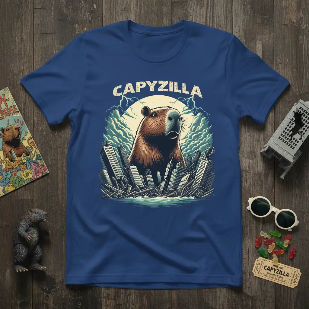 Don’t miss out on the chance to own this legendary Capyzilla t-shirt. It’s the ultimate fusion of adorable rodent and terrifying monster, guaranteed to bring a unique flair to your wardrobe. This tee is perfect for expressing your personality and your appreciation for creative, meme-worthy designs. Order yours now and prepare to unleash your wild side with the most epic capybara the world has ever seen!