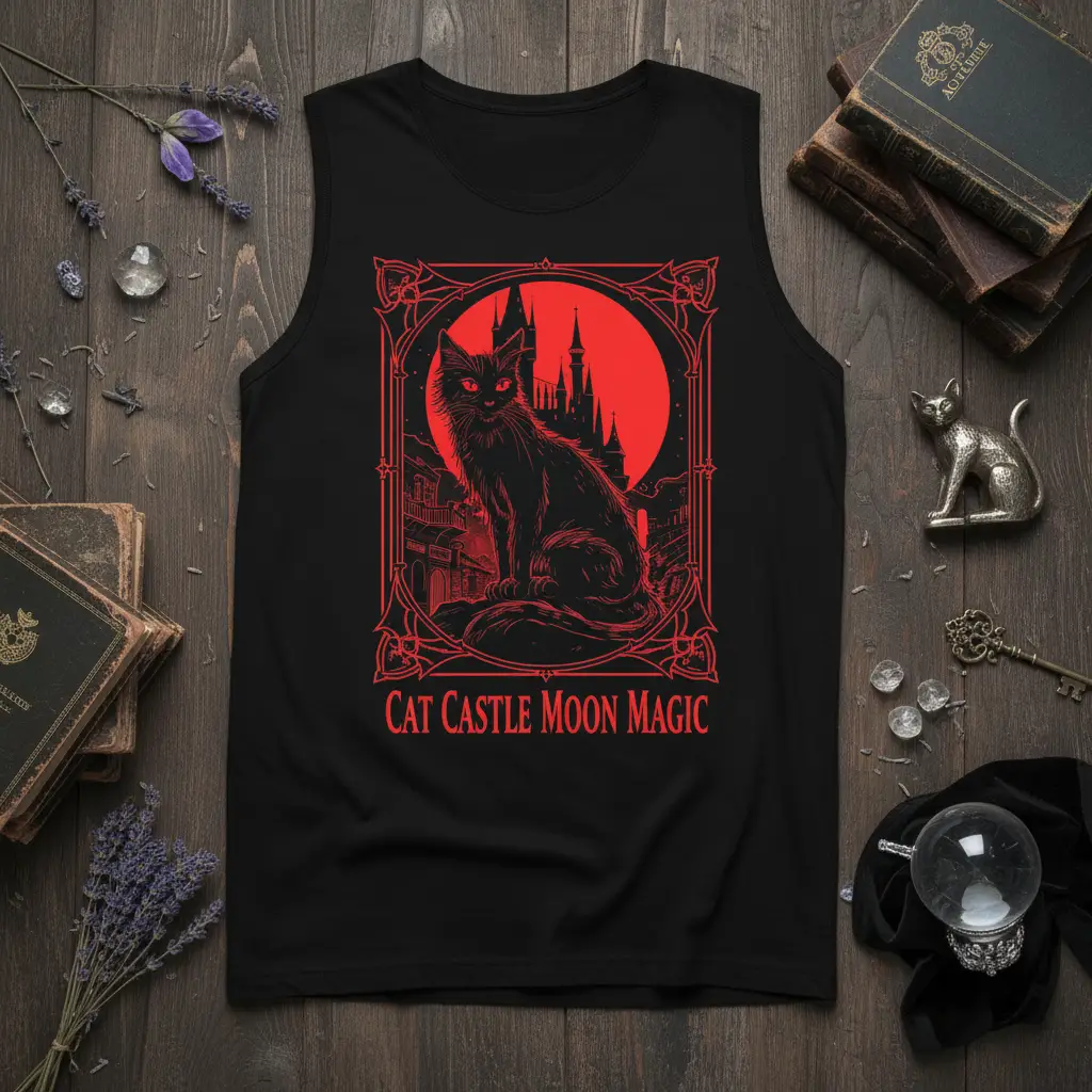 Cat Castle Moon Magic comes to life on this striking tank top, designed for those who find beauty in the mystical and charm in the feline. This apparel piece captures the essence of enchantment, featuring a captivating black cat perched before a gothic castle under the glow of a vibrant moon. It’s more than just a garment; it’s a statement of your affinity for the mysterious and the magical elements that weave through our lives. The intricate design details evoke a sense of wonder and allure, making it a standout addition to any wardrobe for those who appreciate unique and themed clothing. Embrace the magic and let your style speak volumes.