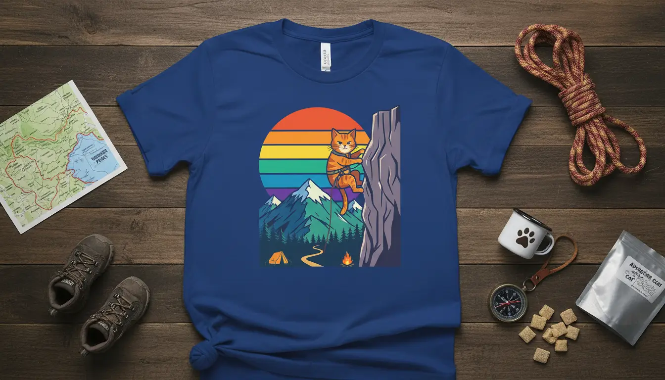 Cat Climbing Mountain designs are perfect for those who embrace adventure and have a soft spot for our feline friends. This unique graphic tee captures the thrill of the climb with a charming cat scaling a rugged cliff face. The vibrant retro sunset and picturesque mountain landscape create an eye-catching scene that speaks to the soul of every explorer. It’s a fantastic way to showcase your love for both cats and the great outdoors, blending comfort with an adventurous spirit. This shirt is sure to become a favorite in your casual wear collection.