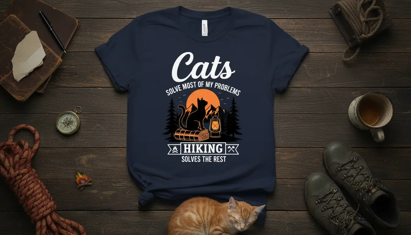 This t-shirt is designed for the true cat enthusiast and the avid hiker, embodying a philosophy that resonates deeply with many. The phrase “Cats Solve Most Of My Problems” acknowledges the incredible therapeutic and comforting presence of our feline friends. They offer unconditional love and a calming influence that can alleviate daily stresses.