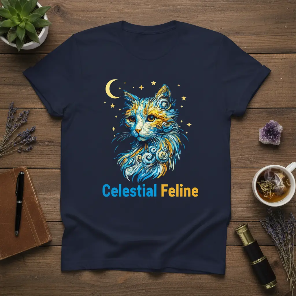Celestial Feline is more than just a t-shirt; it’s a wearable piece of art that captures the mystical connection between cats and the cosmos. This design features a breathtaking portrait of a cat, rendered in vibrant blues, yellows, and whites, with swirling patterns that evoke the magic of nebulae and distant galaxies. Adorned with a crescent moon and sparkling stars, it’s a tribute to the enigmatic beauty of our feline companions and the vast universe they seem to inhabit. This unique graphic tee is perfect for anyone who finds wonder in both the night sky and the grace of cats.