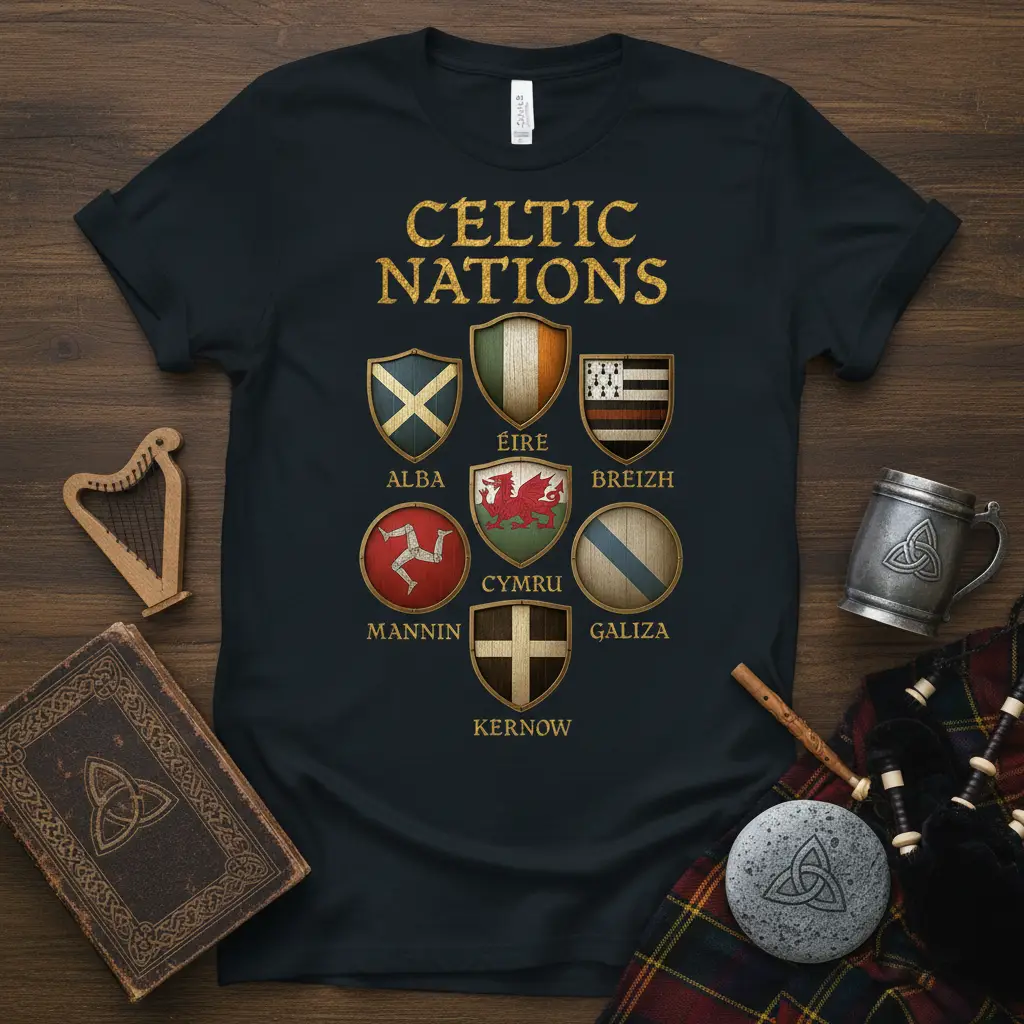 CELTIC NATIONS ALBA ÉIRE BREIZH MANNIN CYMRU GALIZA KERNOW — a sentiment that resonates with so many people. Showcase your proud Celtic heritage with this striking Celtic Nations T-Shirt. This unique design features the distinct flags and names of Alba, Éire, Breizh, Mannin, Cymru, Galiza, and Kernow, arranged in a visually appealing grid. It’s the perfect garment for anyone who cherishes their roots and wants to celebrate the rich history and culture of these ancient lands. The detailed shields and clear typography make this tee a standout piece for expressing your identity and connection to the Celtic spirit. It’s more than just a shirt; it’s a declaration of belonging.