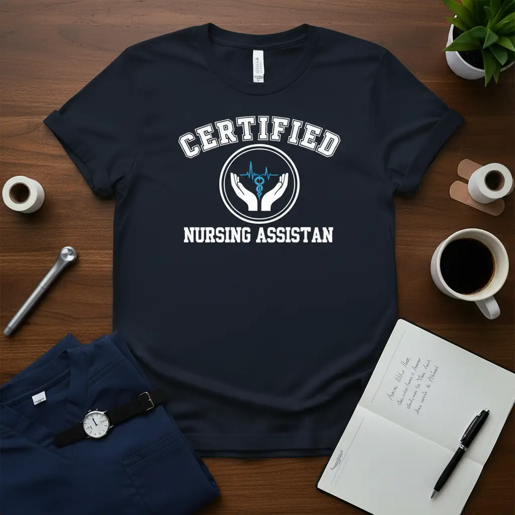 Pick from Black, Navy, Royal, Dark Heather, Red, and White to match your mood and wardrobe staples. Each colorway keeps the CERTIFIED NURSING ASSISTAN design clear and photo-ready for everyday wear.