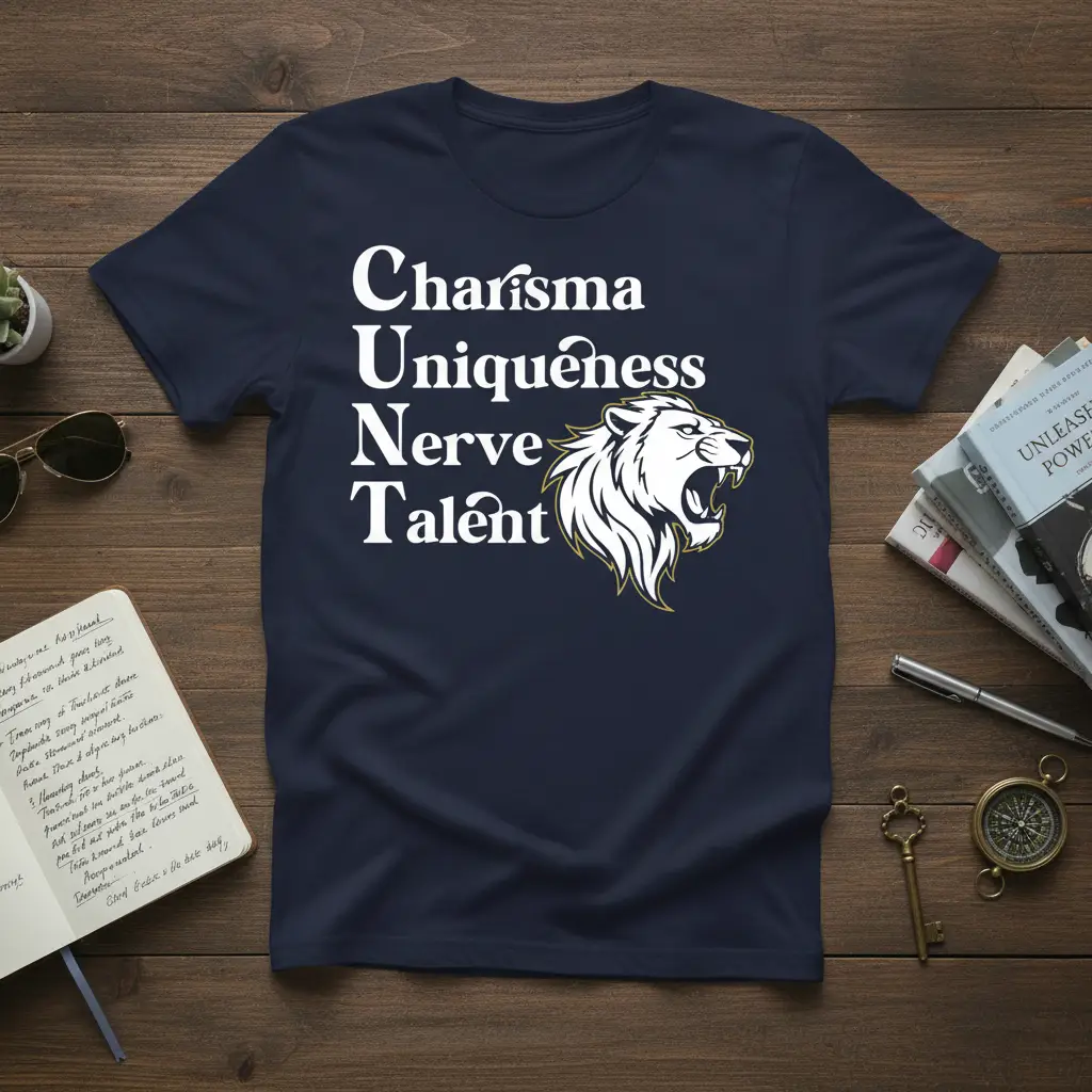 This Charisma Uniqueness Nerve Talent design encapsulates the essence of a truly remarkable individual. Charisma draws people in, creating an aura of magnetism and influence. Uniqueness ensures that they are memorable and distinct, never blending into the background. Nerve signifies the courage to be bold and authentic, while Talent highlights their exceptional skills and abilities.