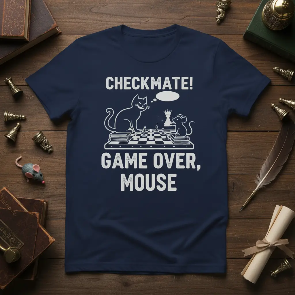 This t-shirt features the full quote “CHECKMATE! GAME OVER, MOUSE” in bold, clear lettering. The accompanying graphic art vividly illustrates a cat poised over a chessboard, facing off against a mouse. The thought bubble above the cat’s head suggests a victorious strategy, making the humorous intent of the design unmistakable.
