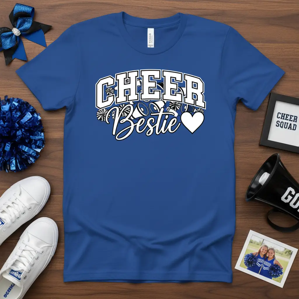 The design features the prominent words “CHEER” in a classic collegiate style and “Bestie” in a flowing script, symbolizing the unique relationship between cheer partners. Accompanying graphics like pom-poms and a heart add an extra touch of flair and enthusiasm. This shirt is crafted for comfort and durability, ensuring it becomes a favorite piece in your wardrobe.