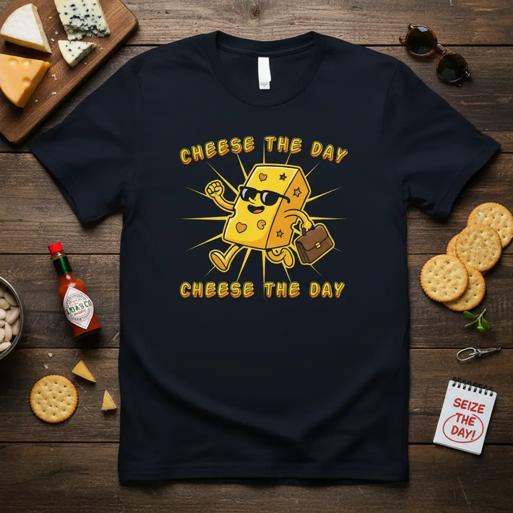 Cheese The Day Cheese The Day is more than just a catchy phrase; it’s a lifestyle motto for those who appreciate the finer, more delicious things in life, especially when it involves dairy. This t-shirt captures that spirit with a fun, cartoonish design that’s sure to bring a smile to your face and the faces of those around you. It’s the perfect way to express your love for cheese and your zest for life, all while staying comfortable and stylish. Whether you’re a seasoned foodie or just someone who enjoys a good pun, this tee is designed to make a statement. Embrace the cheesy goodness and wear your passion proudly.