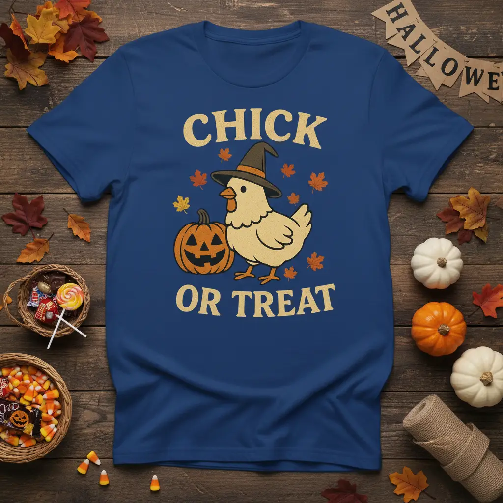 Pick from Black, Navy, Royal, Dark Heather, Red, and White to match your mood and wardrobe staples. Each colorway keeps the Chick or Treat design clear and photo-ready for everyday wear.