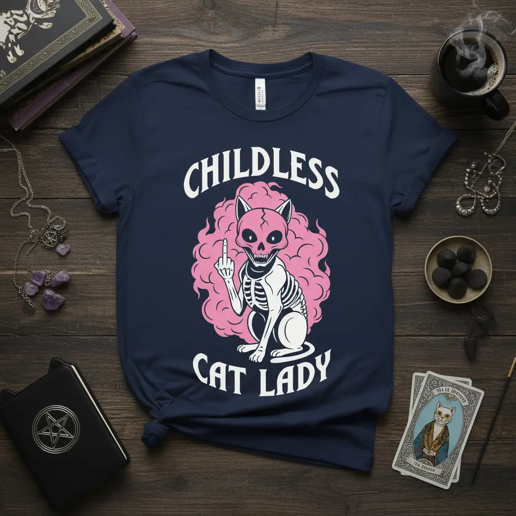 The design features a skeleton cat, a symbol that blends spooky aesthetics with feline charm. This edgy graphic, combined with the bold text, creates a powerful visual statement. It’s a perfect gift for yourself or the fiercely independent cat lover in your life who truly embodies the “childless cat lady” ethos.