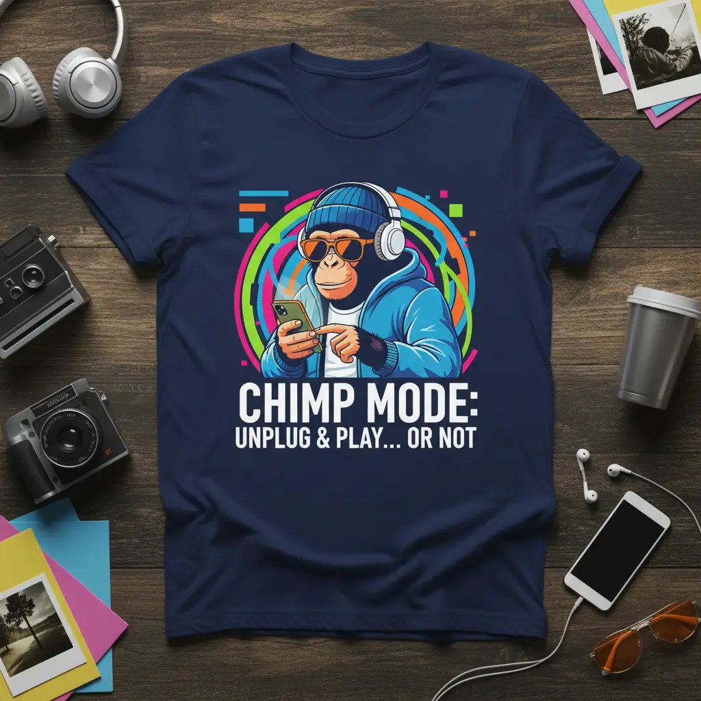 This “CHIMP MODE: UNPLUG & PLAY… OR NOT” t-shirt is perfect for anyone who loves a good laugh and a bit of tech humor. Featuring a cool chimp with headphones and a phone, it’s a comfortable and unique addition to any wardrobe. It also makes a fantastic gift for friends and family who appreciate a playful take on modern life.