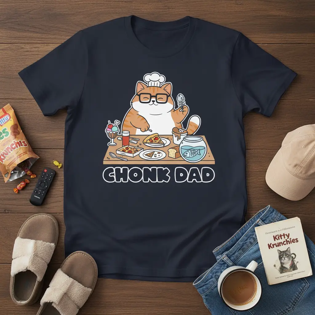 Chonk Dad. This humorous t-shirt is designed for the ultimate cat-loving father figure who appreciates a good meal and the companionship of his feline friends. It captures the essence of a dad who might enjoy a hearty appetite and has a special place in his heart for his cats. The design is sure to bring smiles and laughter to anyone who sees it. It’s more than just apparel; it’s a declaration of love for both dads and cats.
