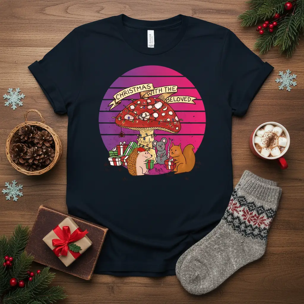 The collection of woodland creatures featured in this design adds an extra layer of charm and whimsy to the CHRISTMAS WITH THE BELOVED theme. The hedgehog, mouse, and squirrel are illustrated with endearing details, creating a sense of warmth and friendship. Their presence alongside the decorated mushroom and gift boxes evokes a cozy, storybook atmosphere, making this t-shirt a delightful choice for anyone who loves cute and festive graphics. These characters are sure to capture the hearts of both children and adults alike.
