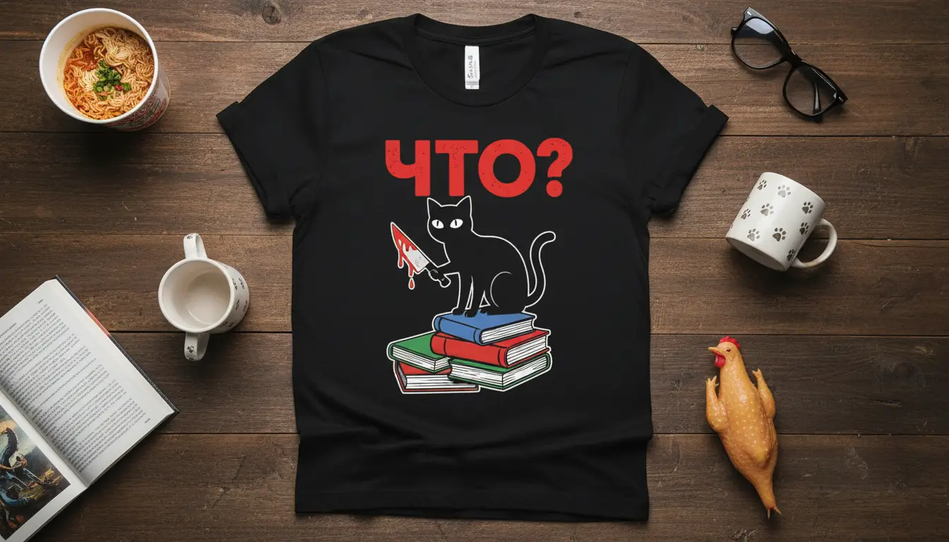 This unique t-shirt design is more than just apparel; it’s a statement piece that blends cultural intrigue with playful menace. The stark contrast of the red “ЧТО?” against the black fabric ensures it stands out, while the detailed illustration of the cat and books adds depth and character. It’s an ideal choice for anyone looking to express their personality with a touch of the unexpected and a hint of literary flair.