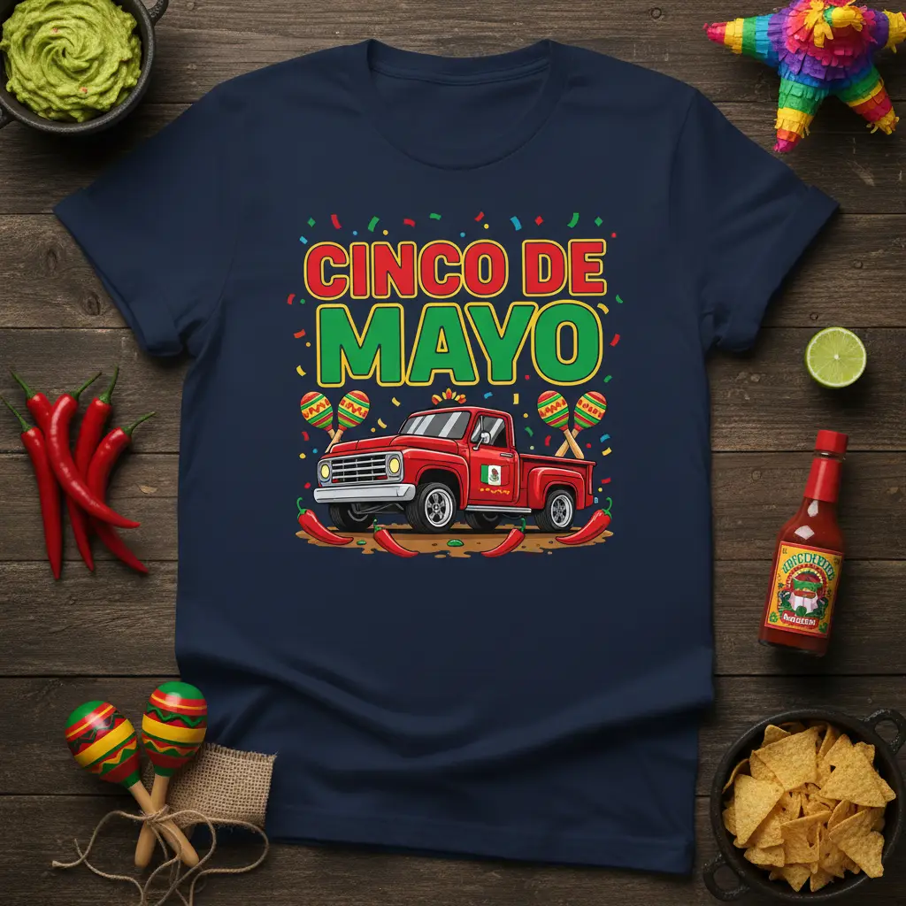 This t-shirt proudly displays “Cinco de Mayo” in bold, festive lettering, immediately setting the mood for celebration. The central graphic of a red vintage pickup truck, complete with Mexican flag accents and decorated with maracas, embodies the joy and energy of the holiday. Surrounded by lively confetti and spicy chili peppers, this design is a visual feast that perfectly represents the spirit of this beloved Mexican holiday.