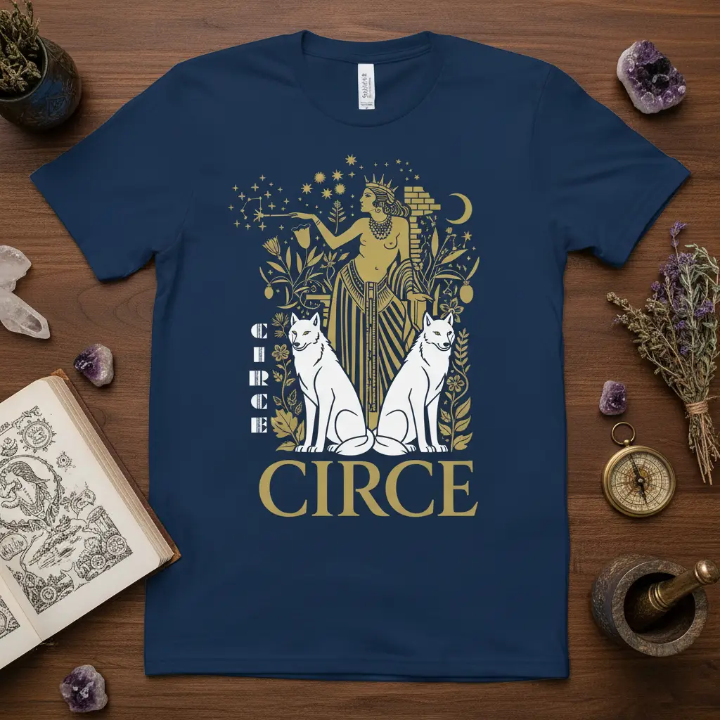 This t-shirt showcases a beautifully rendered depiction of Circe, the daughter of Helios and the sorceress renowned for her mastery of potions and transformations. The artwork is detailed, featuring the goddess adorned in regal attire, surrounded by celestial elements like stars and a crescent moon, hinting at her connection to the cosmos. The design also incorporates lush botanical motifs and the iconic image of two white wolves, often associated with her power and dominion over nature.
