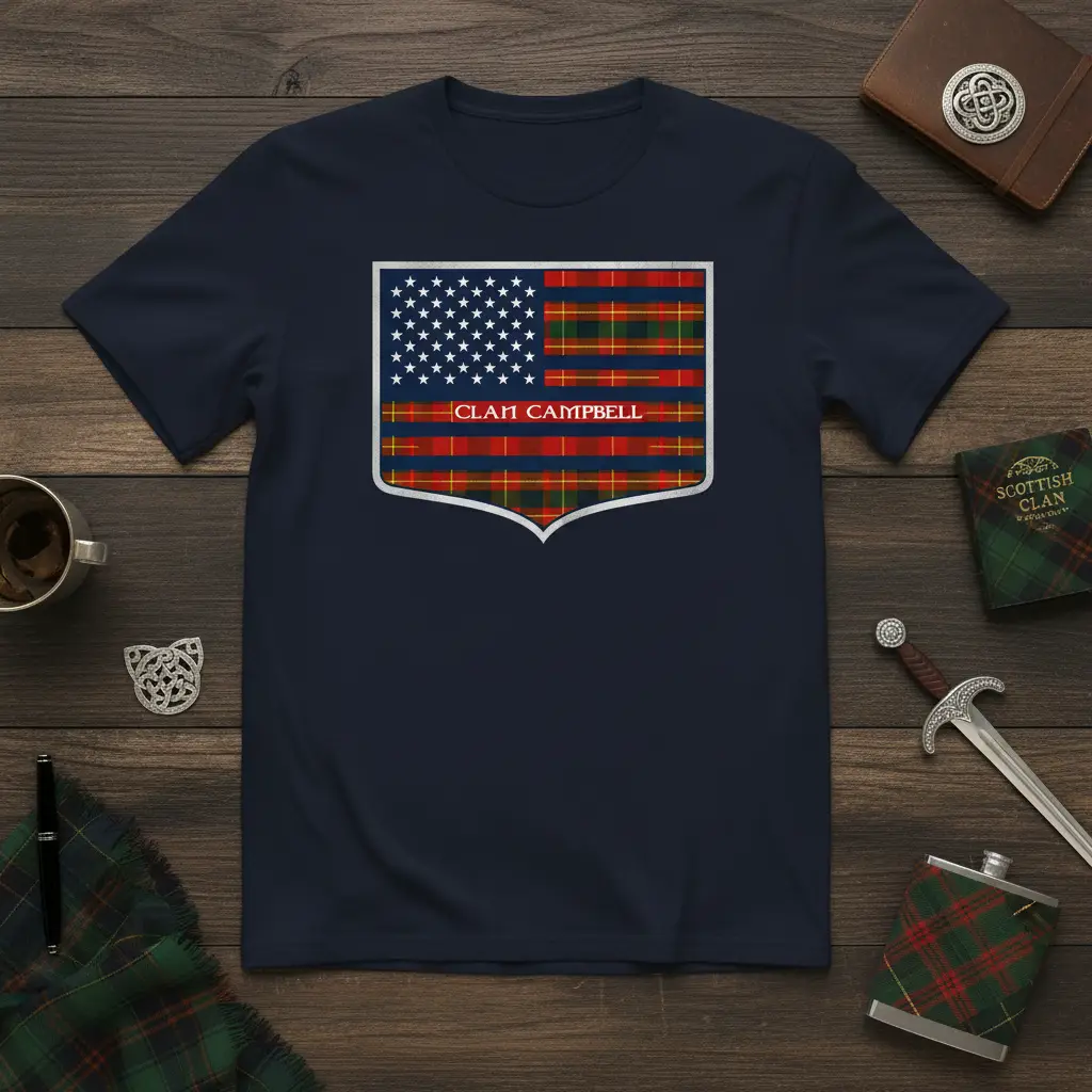 Clan Campbell pride is beautifully represented in this unique t-shirt, designed for those who cherish their Scottish heritage and American roots. This distinctive apparel features a striking shield emblem that masterfully blends the iconic Stars and Stripes of the United States flag with the rich, traditional plaid of the Campbell tartan. It’s more than just a garment; it’s a statement of identity, a connection to ancestry, and a celebration of enduring family ties. Perfect for gifting or personal wear, this tee allows you to showcase your lineage with style and honor.