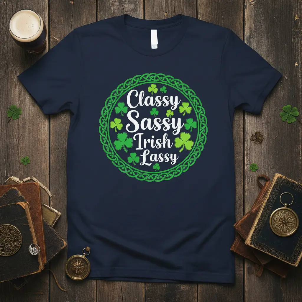 This t-shirt is designed to be the ultimate companion for any St. Patrick’s Day event. The “Classy Sassy Irish Lassie” text is beautifully presented within a circular design featuring vibrant shamrocks and an intricate Celtic knot border, symbolizing luck and heritage. The combination of playful typography and traditional Irish motifs creates a look that is both modern and timeless. It’s a conversation starter that allows you to share your festive spirit and Irish pride with everyone you meet.