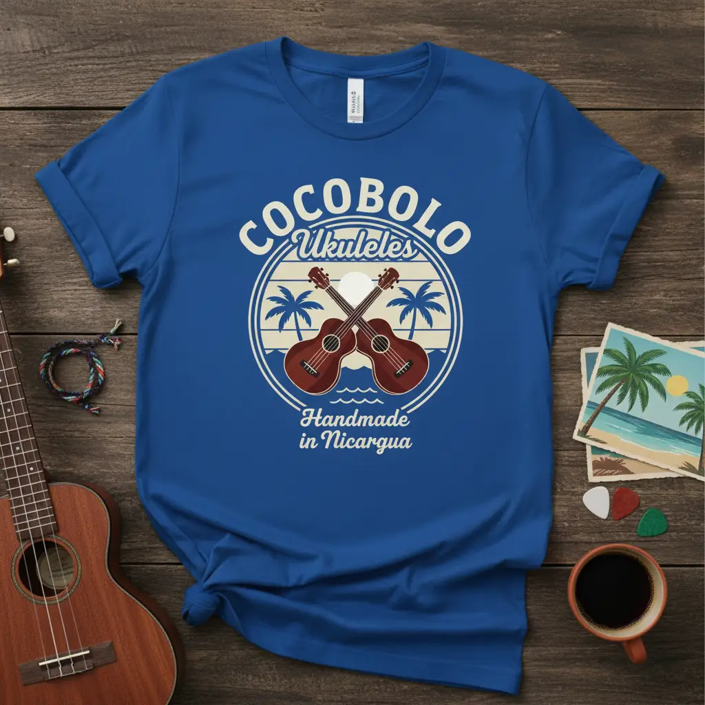 Pick from Black, Navy, Royal, Dark Heather, Red, and White to match your mood and wardrobe staples. Each colorway keeps the COCOBOLO Ukuleles Handmade in Nicaragua design clear and photo-ready for everyday wear.