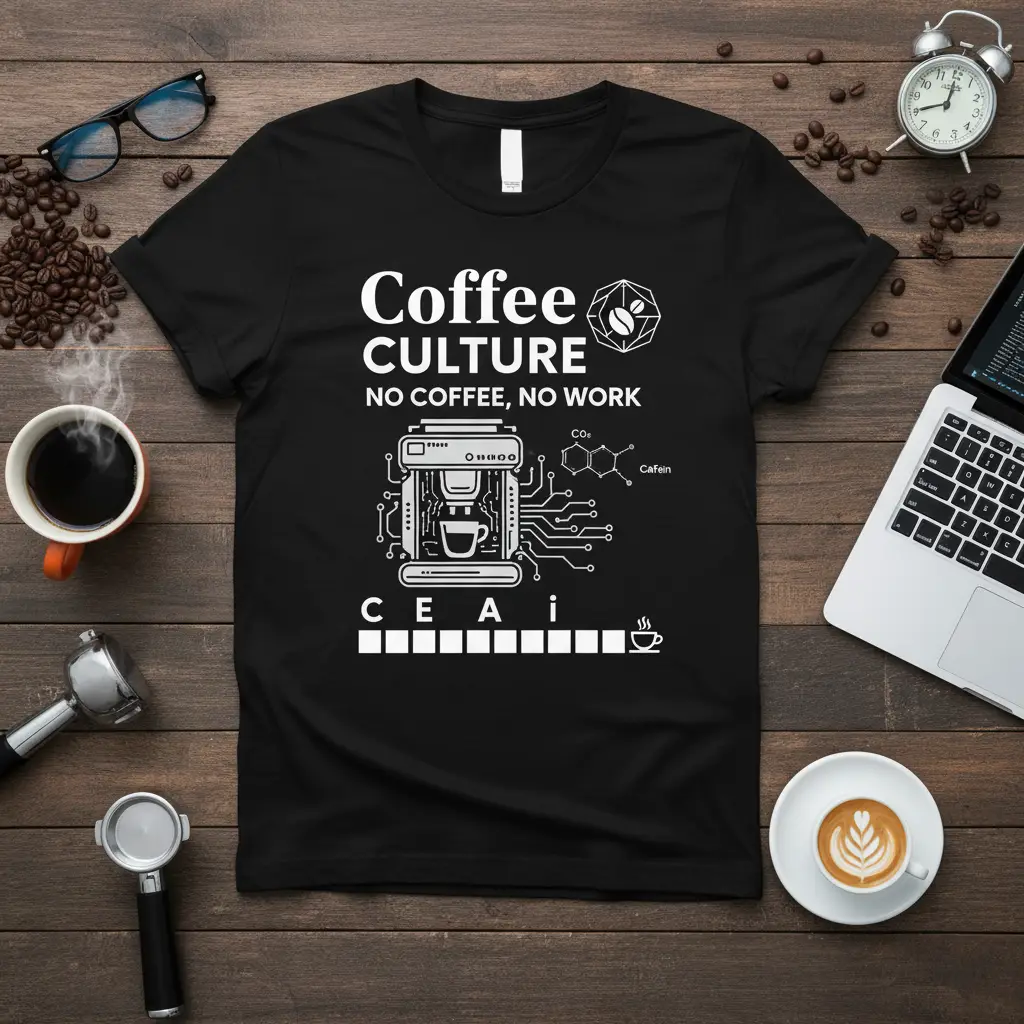 This Coffee CULTURE NO COFFEE, NO WORK design speaks volumes to anyone whose productivity and mood hinge on that first sip. The graphic elements, including a stylized coffee machine and scientific representations of key components like CO2 and caffeine, highlight the blend of art and science that makes coffee so captivating. It’s a nod to the intricate processes and the vital energy boost that coffee provides, making it indispensable for many. This shirt is a must-have for anyone who proudly identifies as a coffee lover.