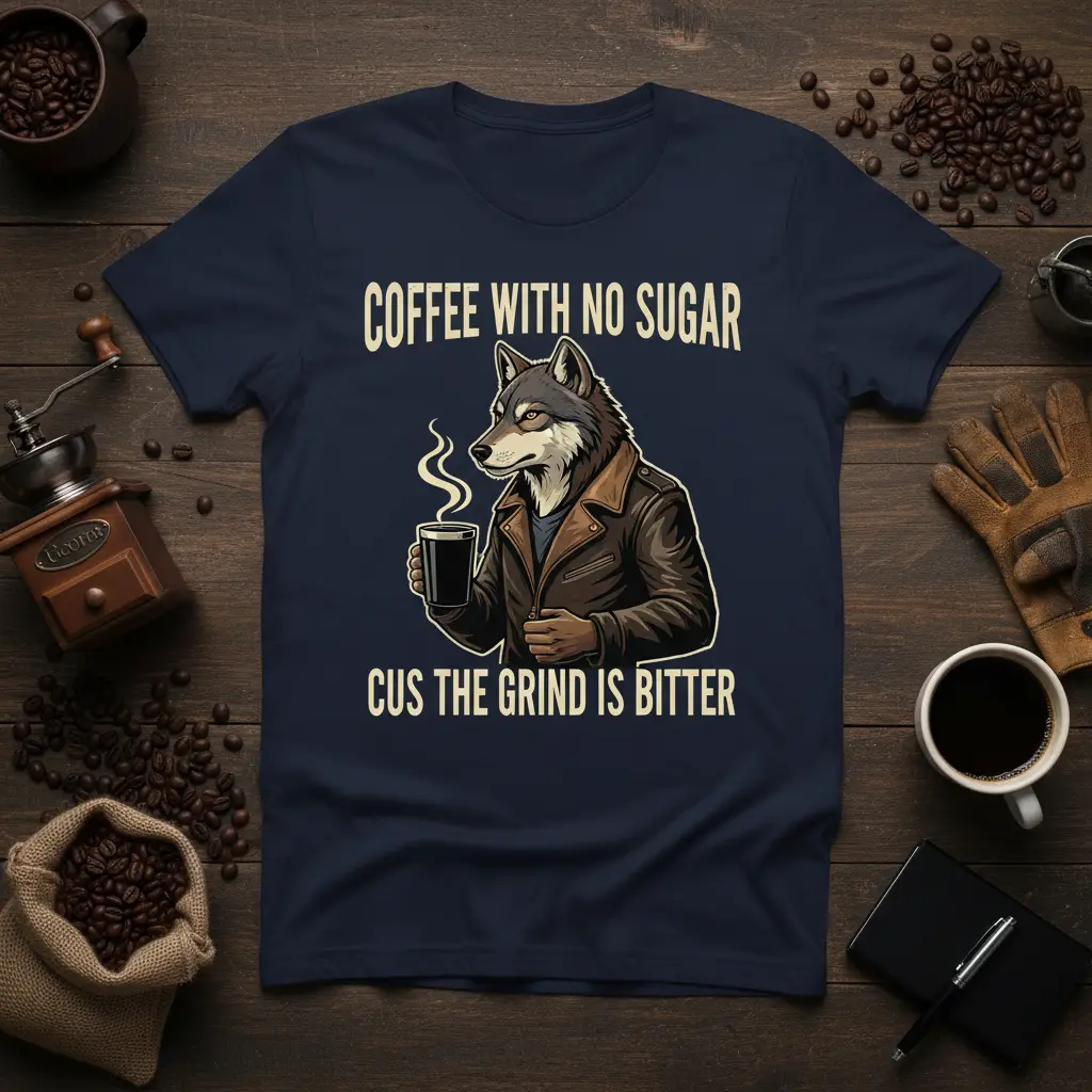 Coffee With No Sugar Cus The Grind Is Bitter is more than just a phrase; it’s a lifestyle statement for those who truly understand and appreciate the robust, unadulterated flavor of their favorite brew. This t-shirt captures that sentiment perfectly, featuring a striking graphic of a wolf, embodying a certain wild, independent spirit, confidently holding a steaming cup of coffee. It’s designed for the discerning coffee lover who knows that the true essence of coffee lies in its natural, often bitter, profile, without the need for added sweetness. This tee serves as a badge of honor for early risers and night owls alike who rely on that potent morning kickstart or late-night fuel.