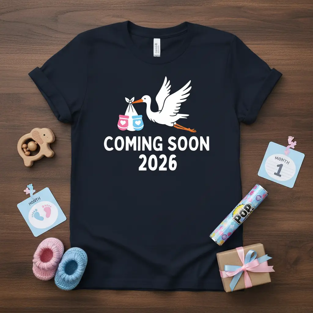 Coming Soon 2026 is the perfect phrase to capture the excitement and anticipation of a new arrival. This t-shirt is designed for expectant parents, grandparents-to-be, or anyone looking to share their joyful news with the world. It features a classic stork graphic, symbolizing the traditional bearer of babies, carrying two adorable bundles. The clear and bold lettering ensures your announcement is seen and celebrated. This tee is more than just clothing; it’s a wearable announcement that will be cherished in photos and memories.