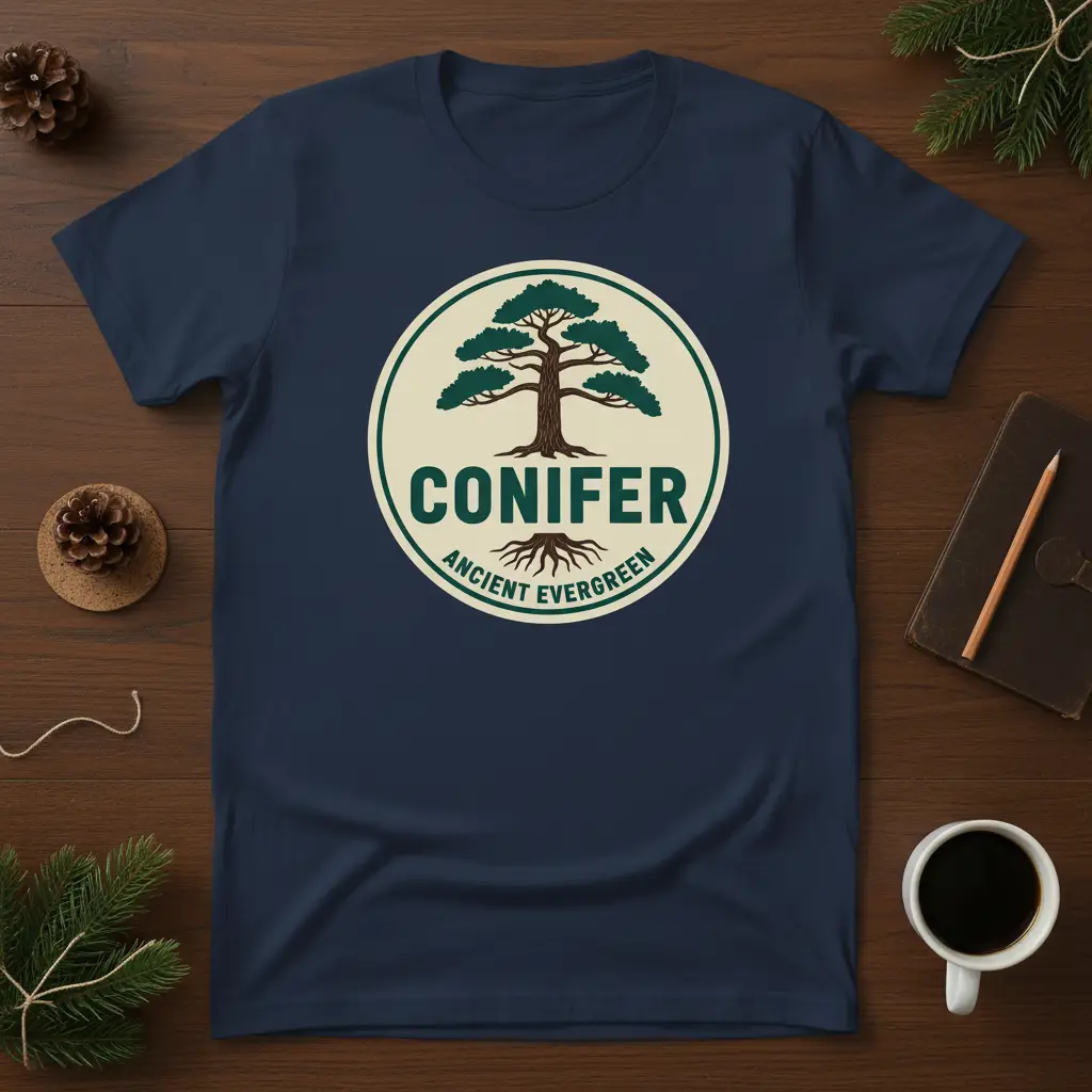 This t-shirt showcases a striking circular emblem, thoughtfully designed to evoke the enduring spirit of the conifer tree. At its heart, a beautifully rendered evergreen stands tall, its roots deeply grounded, symbolizing resilience and longevity. The bold, clean typography of “CONIFER” sits prominently beneath the tree, immediately identifying the subject, while “ANCIENT EVERGREEN” arcs gracefully below, reinforcing the theme of timeless natural wonder.