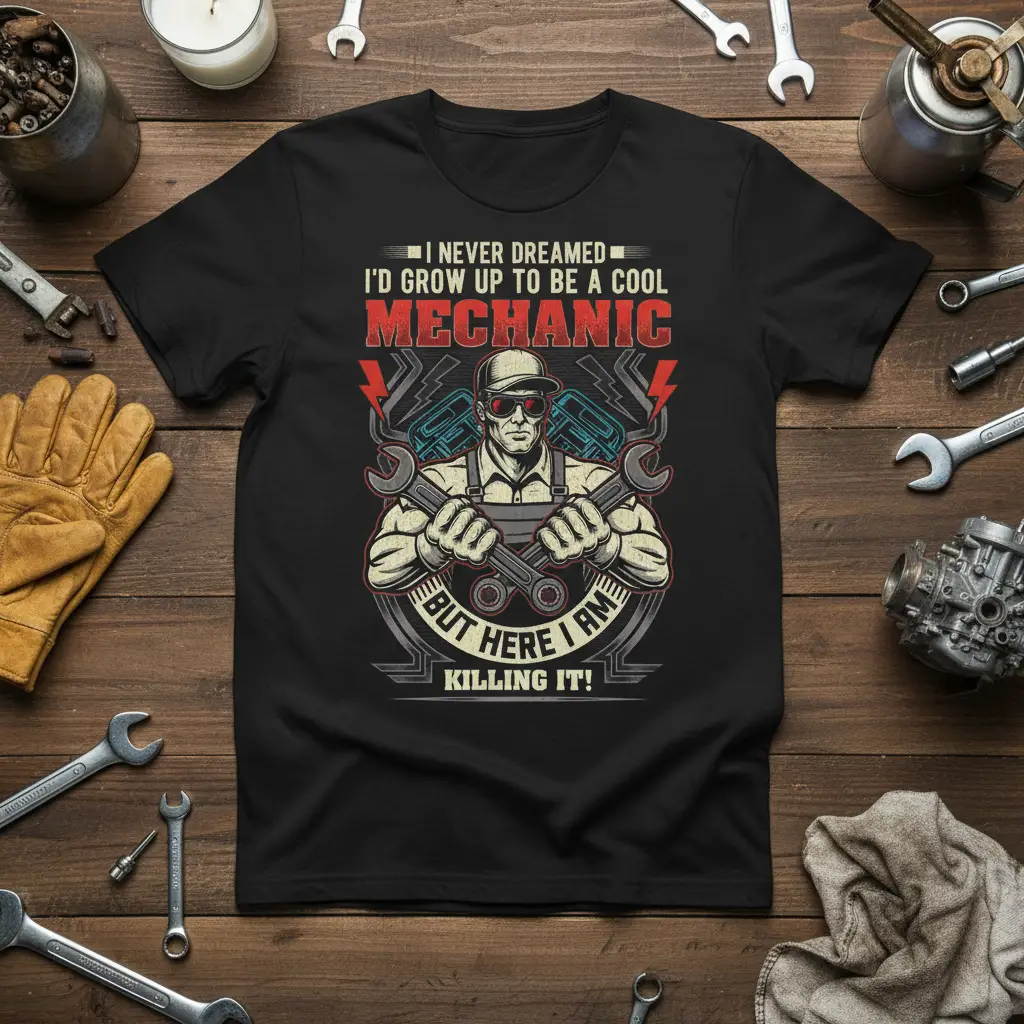 This “I NEVER DREAMED I’D GROW UP TO BE A COOL MECHANIC BUT HERE I AM KILLING IT!” t-shirt is more than just clothing; it’s a declaration of passion and skill. It embodies the spirit of those who excel in automotive repair, turning complex challenges into successful solutions. The design is a tribute to the dedication, precision, and sheer talent that defines a great mechanic, making it a must-have for anyone proud of their profession.