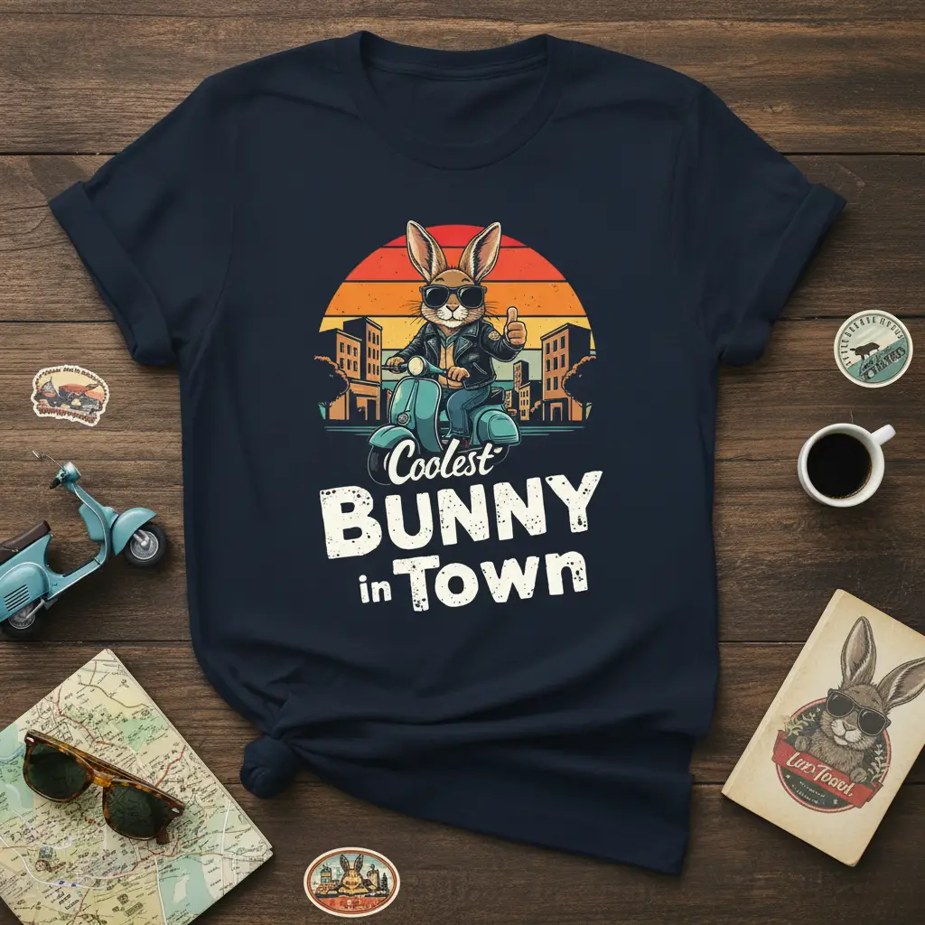 This t-shirt proudly features the phrase “Coolest Bunny in Town” in bold, eye-catching lettering. The graphic itself is a vibrant illustration of a stylish rabbit cruising on a scooter, complete with sunglasses and a leather jacket. Set against a colorful sunset and a stylized city skyline, the design evokes a sense of adventure and retro cool that’s perfect for the spring season and Easter celebrations.