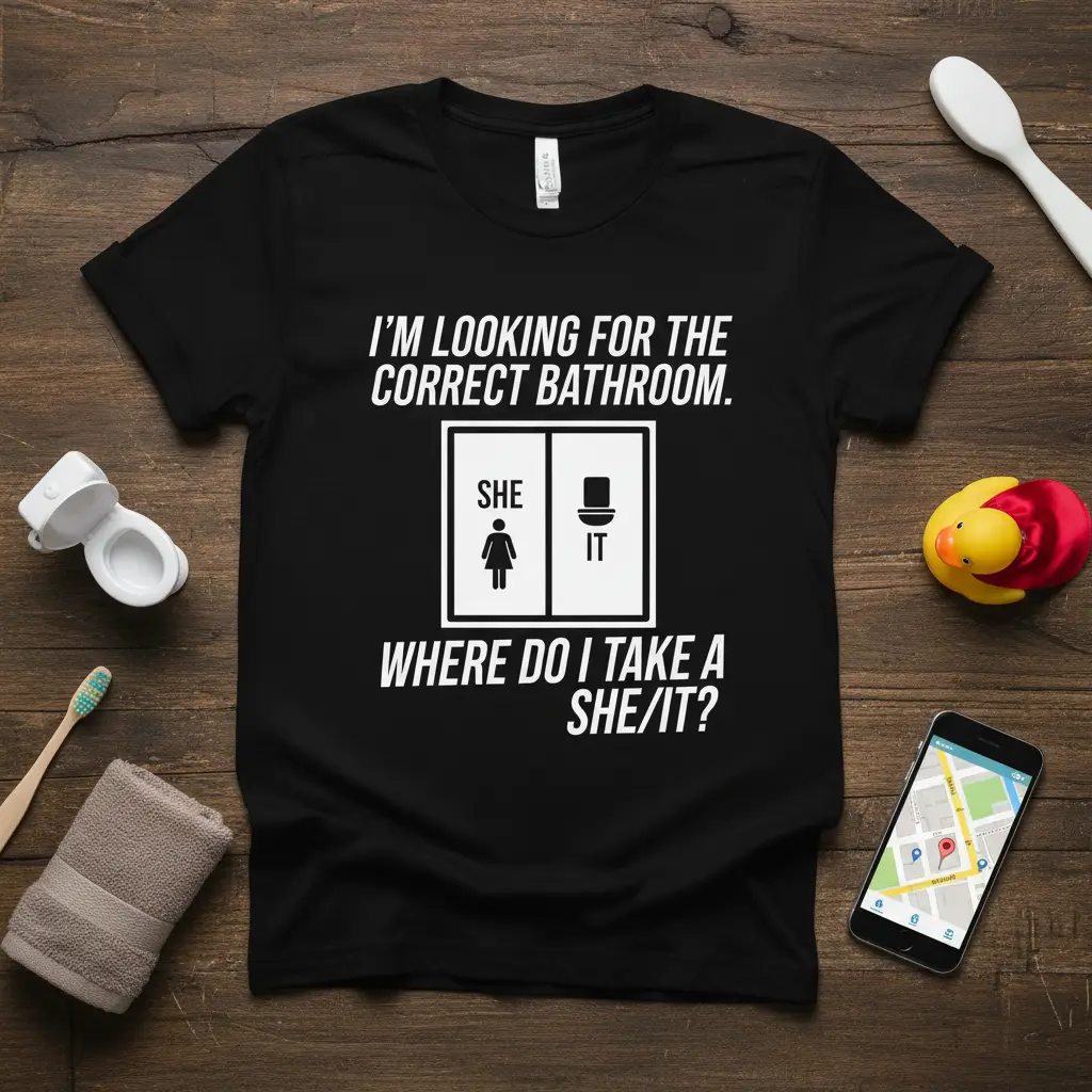I’m Looking For The Correct Bathroom. She It Where Do I Take A She/It? This t-shirt is designed for those who appreciate a good laugh and enjoy a bit of witty commentary on modern life. It humorously addresses the evolving landscape of public restrooms and the nuances of gender-neutral facilities. The design is bold, clear, and instantly recognizable, making it a perfect conversation starter. It’s printed on a comfortable fabric, ensuring you not only make a statement but also feel great wearing it throughout the day.