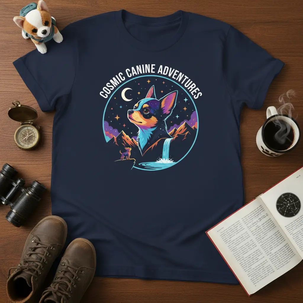 This t-shirt showcases the full “Cosmic Canine Adventures” text, artfully arranged in a circular design around an imaginative scene. The central focus is a colorful chihuahua, depicted with a backpack, gazing out at a breathtaking landscape. The artwork incorporates a majestic waterfall cascading into a serene body of water, framed by rugged mountains and a vibrant, star-filled sky complete with a crescent moon. This design appeals to those who love dogs, space, and the thrill of discovery, making it a standout piece for any occasion.