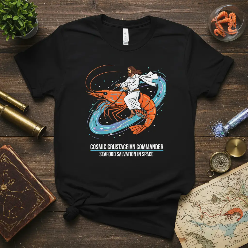 COSMIC CRUSTACEAN COMMANDER SEAFOOD SALVATION IN SPACE is more than just a statement on a t-shirt; it’s a testament to creative expression and the intersection of faith, humor, and the vast unknown. This unique graphic tee brings together an iconic figure with an unexpected celestial journey, offering a conversation starter that’s both thought-provoking and hilariously absurd. It’s designed for those who appreciate the unconventional and aren’t afraid to wear their sense of humor proudly. This apparel is perfect for anyone looking to add a touch of the extraordinary to their wardrobe, celebrating the wonders of the universe and the simple pleasures of seafood in one unforgettable design.