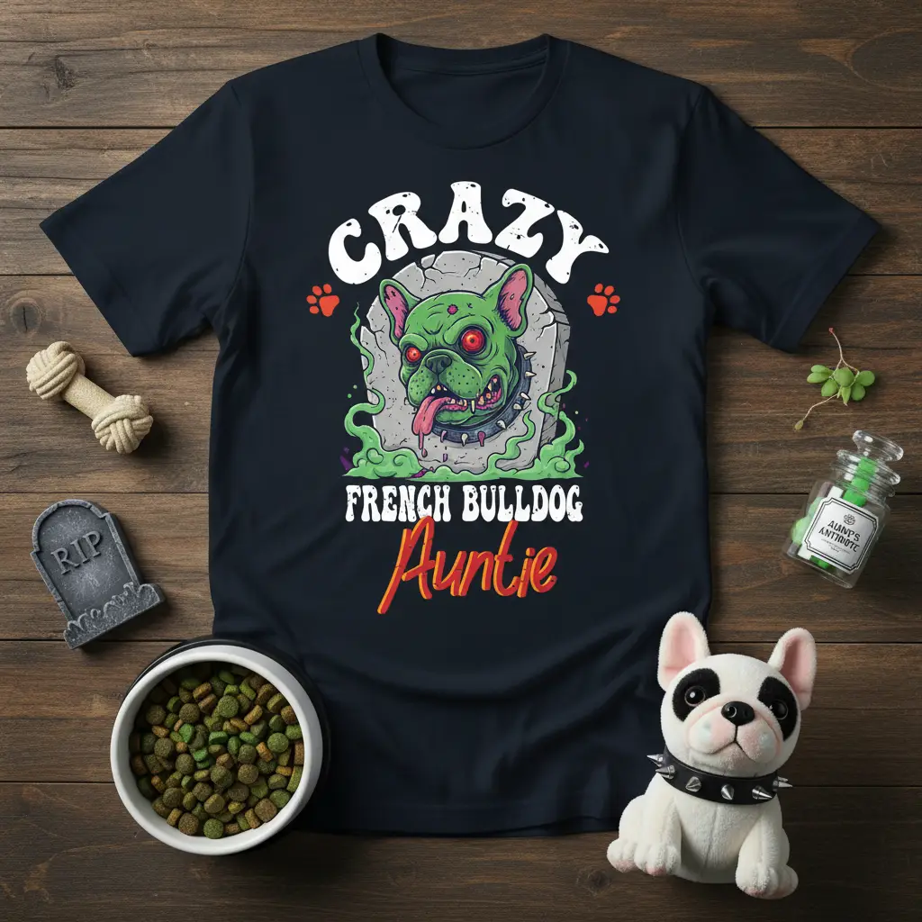 Embrace the fun and spirited nature of being a French Bulldog aunt with this uniquely designed t-shirt. The graphic features a vibrant, green French Bulldog with a playful, slightly mischievous expression, emerging from a tombstone-like element. This Crazy French Bulldog Auntie design perfectly encapsulates the “crazy” aspect of loving these charming dogs, blending a touch of Halloween-inspired spookiness with undeniable affection. It’s crafted for those who understand the deep connection and joy that French Bulldogs bring into their lives, making it a must-have for any proud Frenchie aunt.