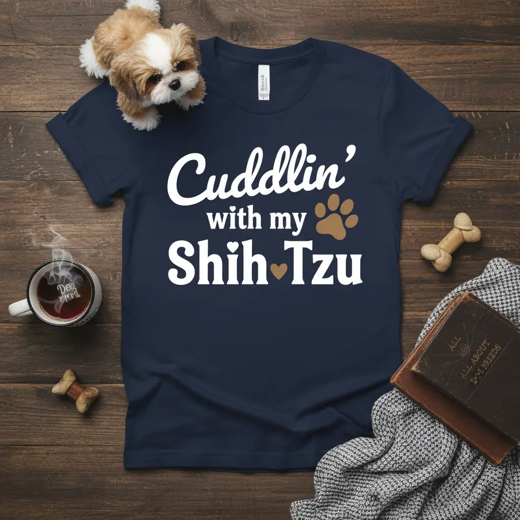 Cuddlin’ with my Shih Tzu is more than just a phrase; it’s a declaration of love for the most loyal and adorable companions. This sentiment is beautifully captured on a comfortable and stylish t-shirt, designed for every proud Shih Tzu owner. It’s the perfect way to wear your heart on your sleeve, or rather, on your chest, showcasing the unique bond you share with your furry best friend.