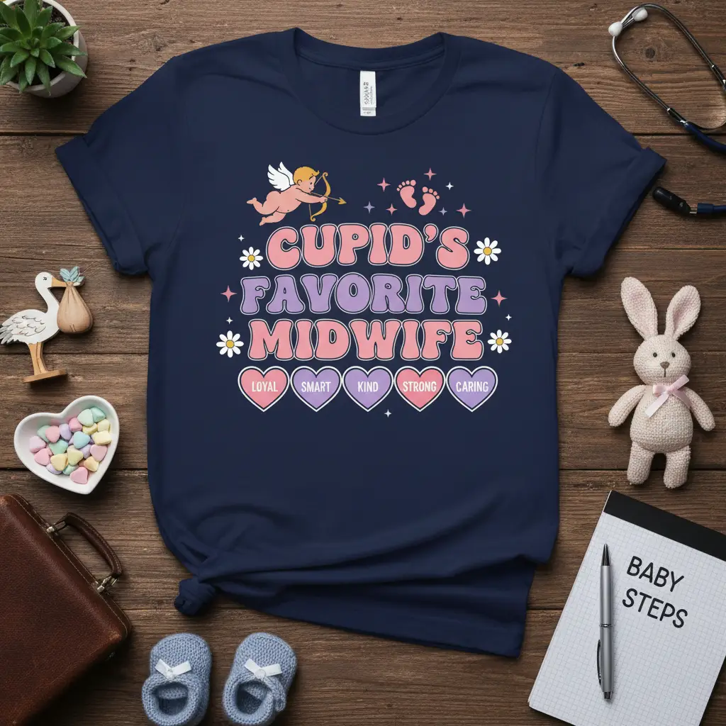 Pick from Black, Navy, Royal, Dark Heather, Red, and White to match your mood and wardrobe staples. Each colorway keeps the Cupid’s Favorite Midwife design clear and photo-ready for everyday wear.