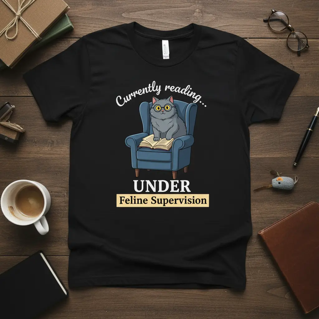 Celebrate your passion for both books and cats with the “Currently Reading Under Feline Supervision” t-shirt. This charming design features a cozy cat overseeing your reading time, making it an ideal gift for any bookworm or cat lover. Enjoy the comfort and quality of this unique and conversation-starting tee.