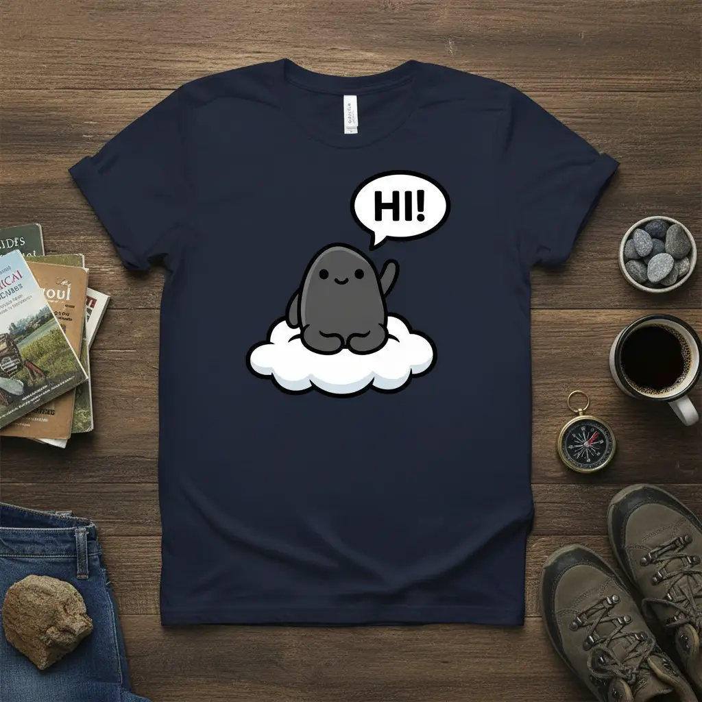 HI! This delightful t-shirt design brings a burst of cheerful energy to your everyday wear. Featuring an adorable, grey, egg-shaped character perched on a fluffy white cloud, it’s ready to spread smiles and friendly vibes. The simple yet impactful “HI!” in a speech bubble makes this tee a perfect conversation starter and a charming way to express your personality. It’s designed for comfort and style, making it a go-to choice for casual outings or relaxing at home.