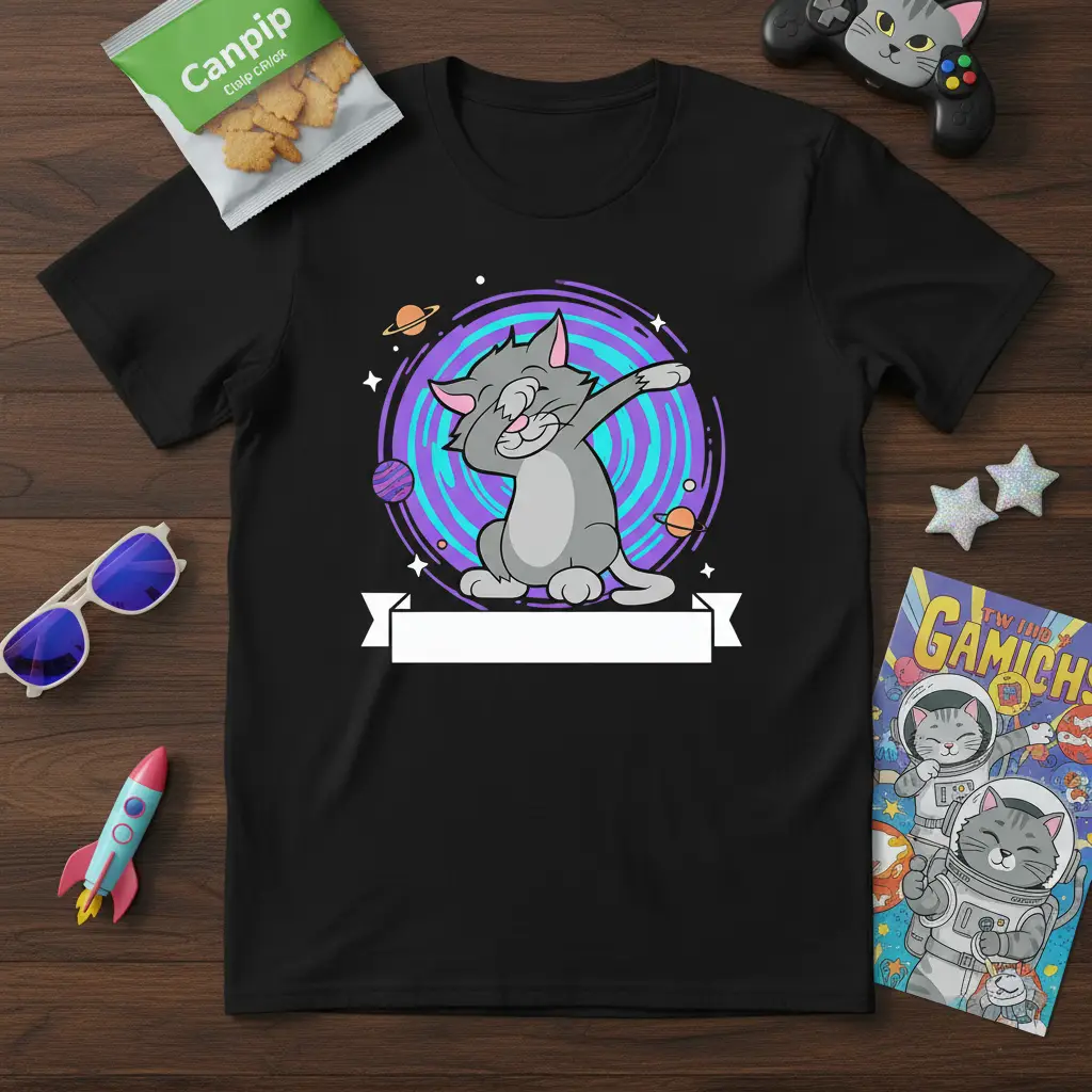 This unique t-shirt showcases a playful grey cat in a dynamic dab pose, surrounded by a swirling vortex of cosmic colors. The design evokes a sense of fun and adventure, making it a perfect addition to any casual wardrobe. It’s an ideal way to express your personality and love for all things feline and space-related. The graphics are crisp and clear, ensuring the design stands out and remains a conversation starter.