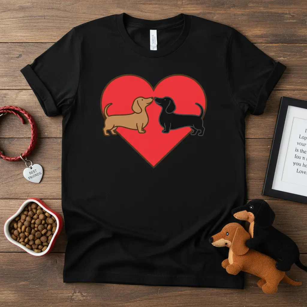 Dachshund Heart Couple T-Shirt designs are perfect for anyone who cherishes their canine companions and wants to wear their love proudly. This charming graphic features two adorable dachshunds, one tan and one black, nestled together within a vibrant red heart. It’s a sweet and whimsical depiction that captures the special bond between dogs and their owners, making it an ideal choice for Valentine’s Day, anniversaries, or simply as a daily expression of affection. The design is rendered in a clean, illustrative style that stands out beautifully on any shirt color.