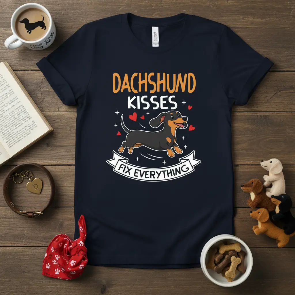The Dachshund Kisses Fix Everything slogan perfectly encapsulates the joy and comfort these dogs provide. Their unique personalities and loving nature make them irresistible companions. This t-shirt is more than just clothing; it’s a wearable declaration of love for the breed and a conversation starter among fellow dog enthusiasts. It’s designed to bring a smile to your face and spread a little bit of dachshund joy wherever you go.