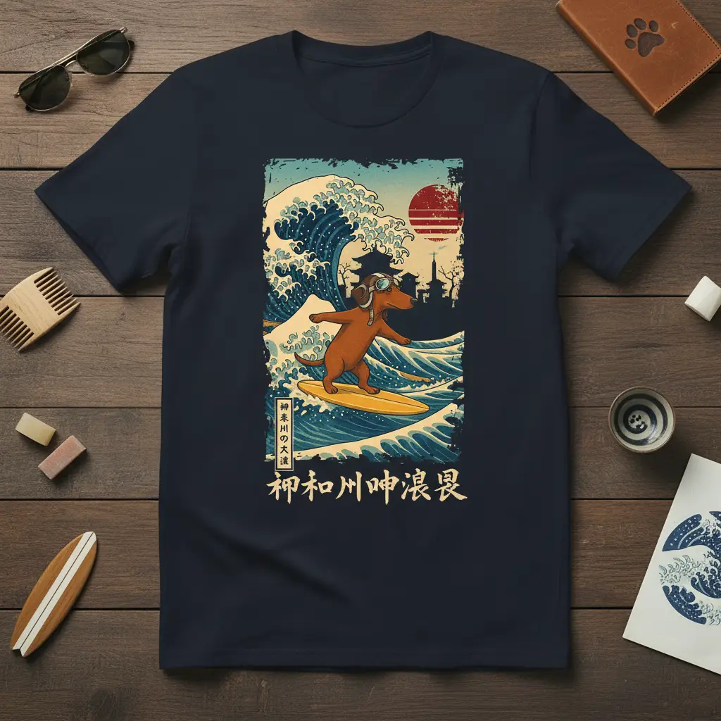 The juxtaposition of the beloved dachshund breed with the powerful imagery of the Great Wave creates a memorable visual. Whether you’re a dachshund enthusiast, a surfing aficionado, or simply someone who loves unique art, this t-shirt is sure to resonate. It’s crafted for comfort and durability, ensuring you look and feel great while showcasing your adventurous spirit.