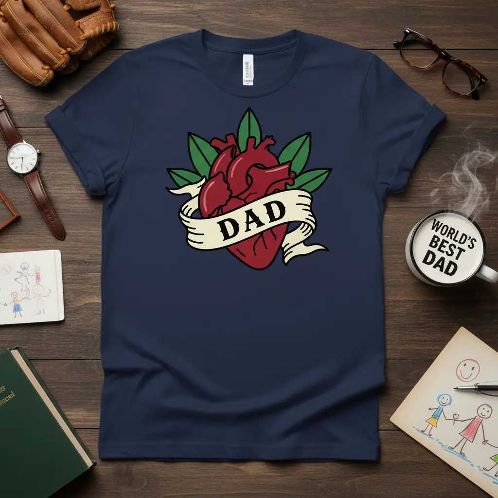 This striking Dad Heart Tattoo design features a beautifully rendered anatomical heart, symbolizing the core of life and love. Wrapped in a classic banner that proudly proclaims “DAD,” this artwork speaks volumes about the profound impact fathers have. The surrounding green leaves add a touch of traditional tattoo artistry, making this tee a standout piece for any proud father. It’s a design that truly captures the heart of fatherhood.