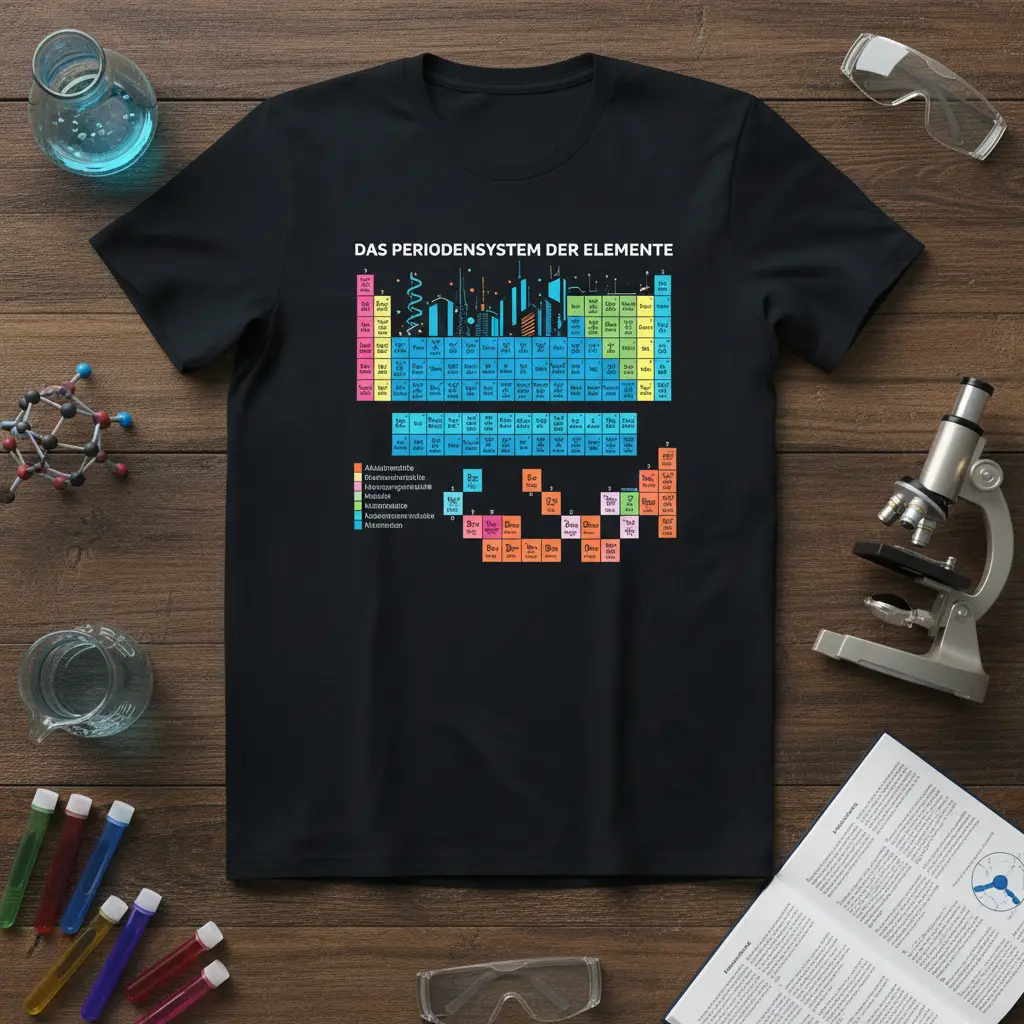 DAS PERIODENSYSTEM DER ELEMENTE T-Shirt is designed for those who appreciate the fundamental building blocks of our universe and enjoy showcasing their scientific curiosity. This t-shirt features a detailed and visually engaging representation of the periodic table, making it a standout piece for any science aficionado. Whether you’re a student, teacher, or simply a lover of all things chemistry, this shirt is a perfect way to express your passion. Its unique design blends educational content with modern aesthetics, ensuring you’ll look smart and stylish. This tee is more than just apparel; it’s a statement of your intellectual interests and a conversation starter. Dive into the world of elements and make a statement with this unique piece of wearable science.